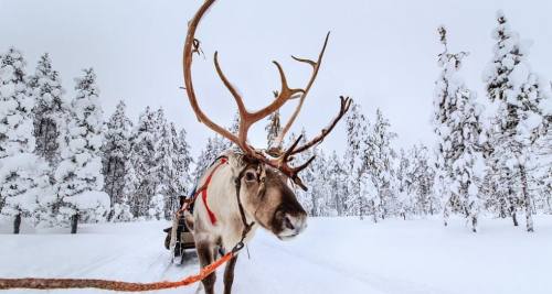 约09:00 乘车前往【驯鹿场】, 您可以跟驯鹿近距离的接触并体验鹿拉雪橇,在热情的萨米人家庭里品尝特色热饮,感受萨米人的热情及环境。