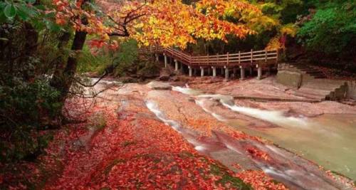 天然画廊:秋风拂过,落叶纷飞,姹紫嫣红,褚红地毯由浅变深,逐渐厚大,演变出变幻无穷的迷人画卷;