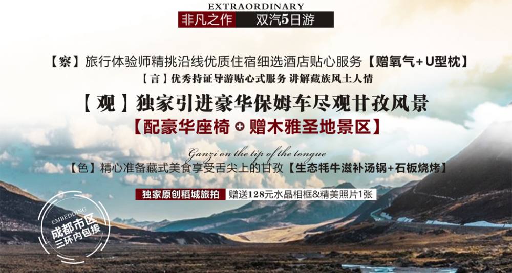 1、关于车辆交通:目前四川旅游市场方面,因8座以下车辆无法办理旅游牌照,游客需对此情况明白无误,不得以此为理由提起投诉。长时间高原行车,途中车辆负荷较重,可能会遇到汽车抛锚并影响行程的情况,请游客做好心理准备。如遇人力不可抗拒因素,如塌方、路阻、车辆故障,当地政府行为等造成行程延误,或不能完成上述景点,责任不在旅行社,旅行社不承担赔偿责任,由此产生的超支费用由游客自理。但我公司会积极配合解决。